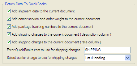 This section allows you to choose the information that will be added to your QuickBooks transaction once shipping is complete. OzLINK will create a single line item in the transaction to hold all of the checked information. For most of the checkboxes, the information will be written in the description column of the line. In the case of "Add shipping charges to the current document (rate column)," the shipping charge will be written in the 'rate' column of the transaction, and will impact the final price on the transaction.
